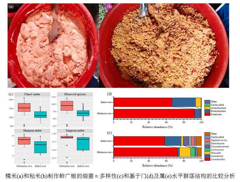 该研究从湖南省湘西土家族苗族自治州采集了27个分别以糯米或籼米为原料制备的鲊广椒样品,并采用宏基因组学策略对其细菌群落的结构和多样性进行了解析。通过代谢途径预测、电子感官技术和代谢物分析,阐明了用于制备的大米品种与鲊广椒中细菌微生物群落、风味和有机酸/氨基酸代谢物之间的关系。研究发现,虽然乳酸菌在鲊广椒中占主导地位,平均相对丰度为77.09%,但不同大米原料制备的鲊广椒其细菌群落结构有明显差异,采用糯米制备的鲊广椒中的细菌种类更为丰富。鲊广椒的香气受到原料本身的影响,而鲊广椒的酸味、鲜味和鲜味的回味与细菌群落结构显著相关,这也使得采用糯米制备的鲊广椒更酸,并让采用籼米制备的鲊广椒带来了更多的味觉感受。该研究的开展为鲊广椒品质的评价提供了参考,为华中地区传统谷物发酵食品的产业化推动提供了数据支持。