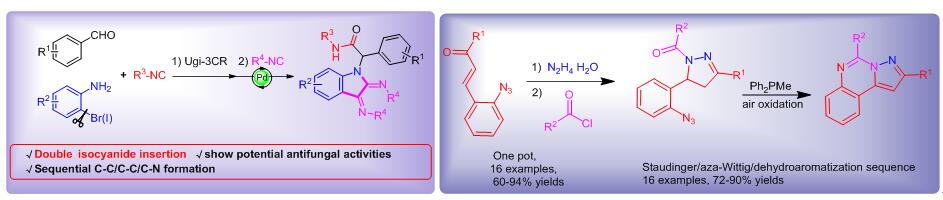 含氮杂环是一类重要的有机化合物,广泛的应用于功能材料和生物医药当中,因此如何建立一条高效的合成氮杂环的方法一直是合成化学中的研究热点。近年来,该团队基于过渡金属催化与异腈化学研究,探索实现一类条件温和、原子经济效率高、反应步骤少和结构多样性高的合成杂环化合物的新方法。