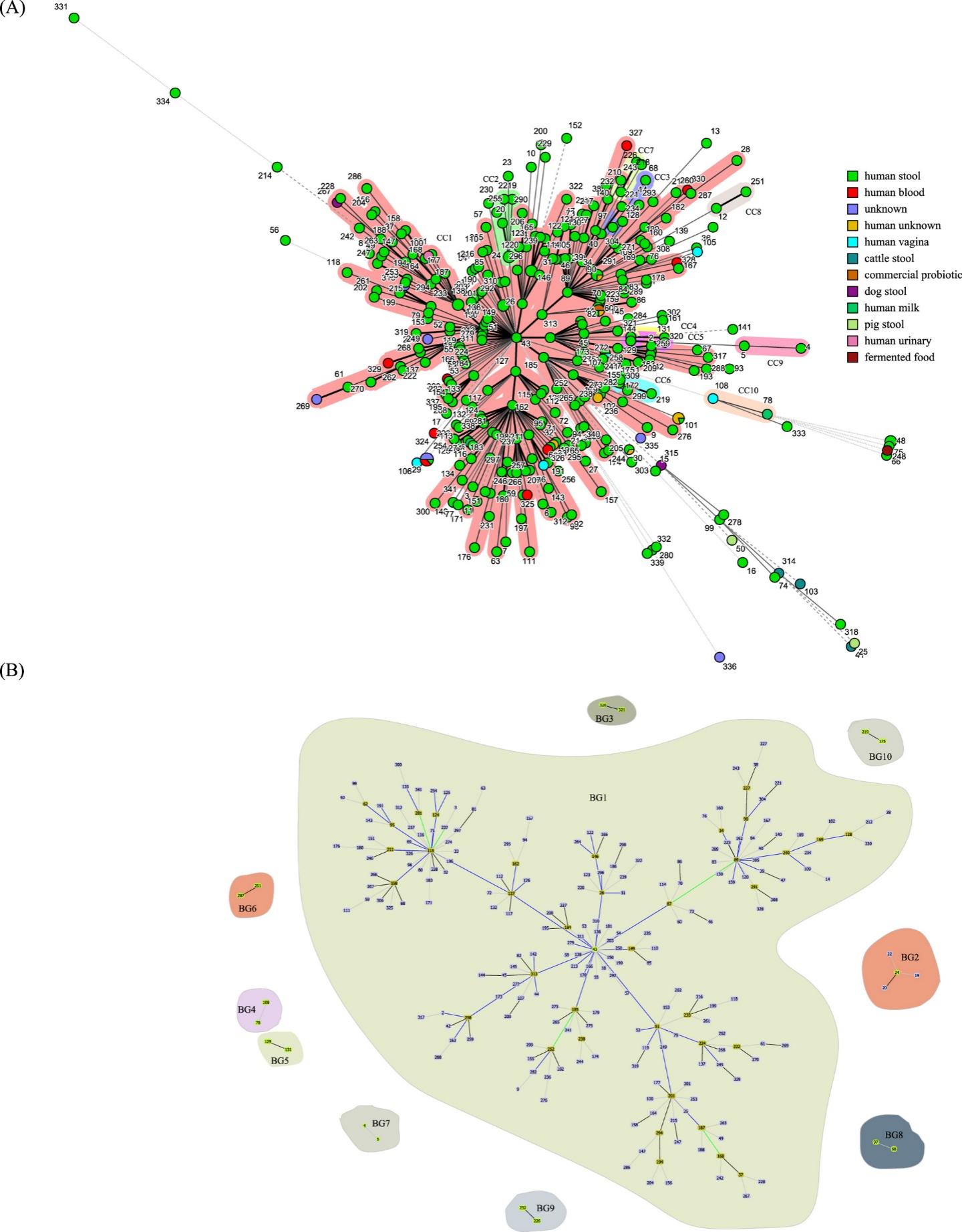 2 基于6个基因座位的437株长双歧杆菌的最小生成树(A)和BURST groups (BGs)聚类分析(B