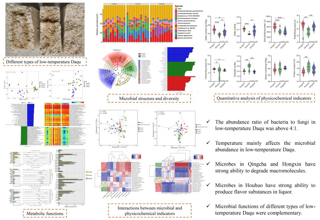 本研究以石花酒业制曲车间的低温大曲为研究对象,采用理化分析、宏基因组测序和微生物纯培养技术相结合的手段,解析了不同类型低温大曲在发酵特性、微生物类群结构等方面的共性和差异,同时揭示了不同类型低温大曲在清香型白酒酿造中各自潜在的功能。研究发现,后火大曲中富集的微生物能够产生白酒中特定的风味产物,青茬和红心大曲中富集的微生物在具备上述功能的同时,亦具有较强的降解原料中大分子物质的能力,可以更好的促进发酵基质中相关微生物类群的生长。