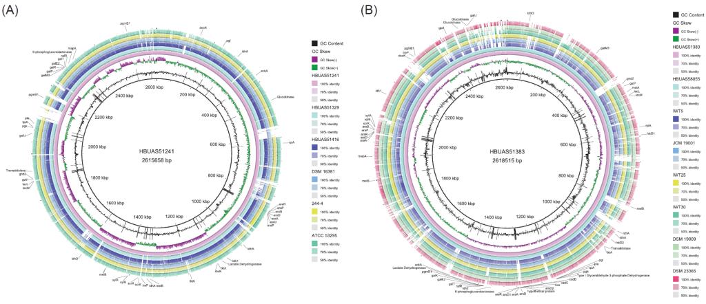 1 Levilactobacillus tujiae HBUAS51241TA)和Secundilactobacillus angelii HBUAS51383 TB)新物种的基因组比较圈图