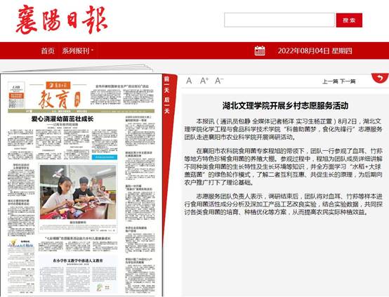 (通讯员 包静 隋哲)2022年8月4日,襄阳日报社以“威廉希尔开展乡村志愿服务活动”为题,报道了公司“科普助菌梦,食化先锋行”志愿服务团队走进襄阳市农业科公司开展的调研活动。