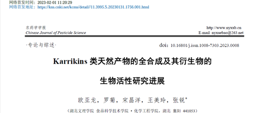 在员工指导工作方面,张锐博士假期以指导老师身份指导化工系本科生2019级(欧亚龙、罗菊)和2020级(宋昌洋、王美玲)撰写的中文综述类文章“Karrikins类天然产物的全合成及其衍生物的生物活性研究进展“经两轮同行评议和主编终审,在农药学领域国产著名期刊《农药学学报》(北大核心期刊&CSCD中国科学引文数据库来源期刊)发表(https://doi.org/10.16801/j.issn.1008-7303.2023.0008)。