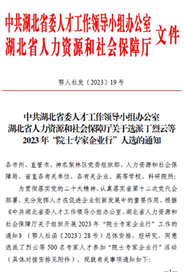 (通讯员 刘向红)日前,中共湖北省委人才工作领导小组办公室、湖北省人力资源和社会保障厅联合发文(鄂人社发[2023] 19号),公布了2023年度“院士专家企业行”专家名单。此次公司共有9位教师成功入选,其中包括公司5位博士教授。