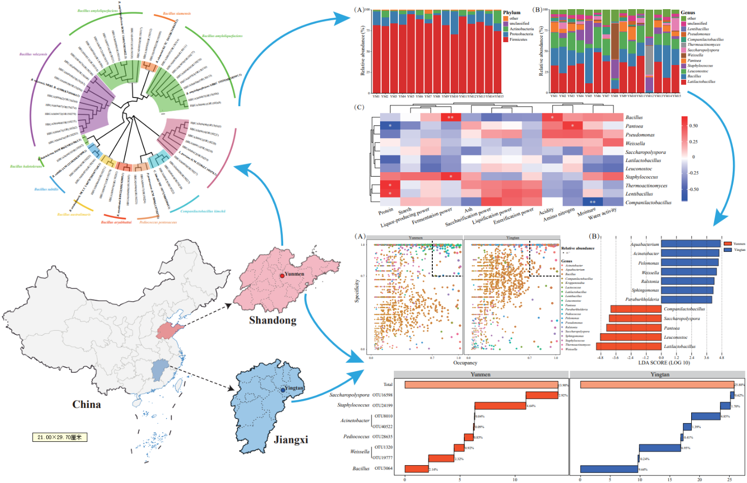 在白酒酿造中大曲具有提供菌系和酶系、风味调控和投粮作用,因而行业内有“曲乃酒之骨”的说法,且由于受生产环境、制曲工艺和原料的影响,不同厂家生产的酒曲品质存在较大差异。本研究以《酱香型白酒》(GB/T 26760-2011)国家标准起草单位——山东青州云门酒业(集团)有限公司的中高温大曲作为研究对象,基于轻工标准中《酿酒大曲通用分析方法》对大曲基础理化指标进行了评价,并利用高通量测序技术和传统纯培养技术对中高温大曲细菌群落结构及其可培养细菌物种进行了解析与挖掘,进而实现了对中高温大曲细菌类群及其理化品质形成机制的揭示。研究结果显示,云门中高温大曲中蕴含的广泛乳杆菌属(Latilactobacillus)、伴生乳杆菌属(Companilactobacillus)、魏斯氏菌属(Weissella)和芽孢杆菌属(Bacillus)等优势细菌属与中高温大曲品质的形成具有积极关系。