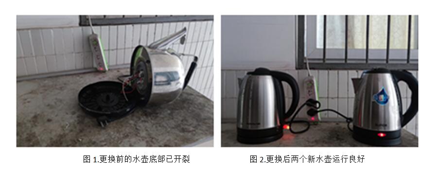 图1中为安全排查中发现原有热水壶底部已开裂,存在严重安全隐患。图2中已更换2只全新的水壶,保障考研学子的实时热水供应。后续公司将引一条专用线路,用于热水壶供电,进一步消除安全隐患。
