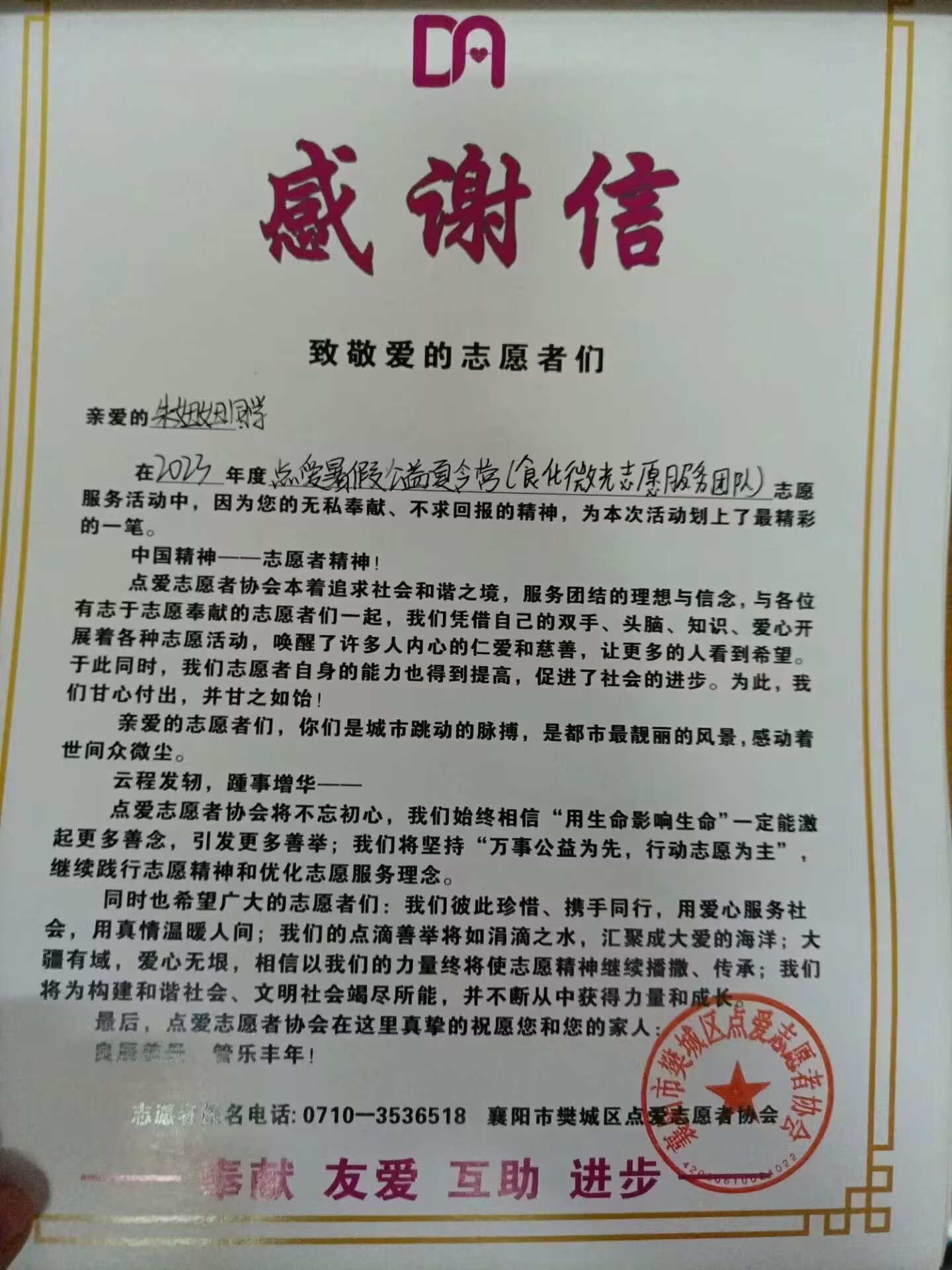 (通讯员 华雨)今年暑期期间,英国williamhill威廉希尔公司 - 中文官方网站组织本院青年员工开展“三下乡”“返家乡”社会实践活动。活动期间员工志愿者们服从大局、听从指挥、团结协作、吃苦耐劳,用实际行动展现了食化学子青春激昂的精神风貌。近日,食化微光志愿团队收到了12封来自襄阳市点爱志愿者协会的感谢信。