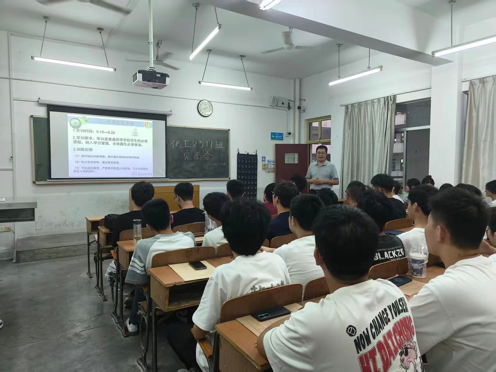 各班主任精心筹备,细致讲解军训着装规范、集合时间、安全防护及应急处理等关键事项,同时组织新生自我介绍,帮助学子快速熟悉彼此。其中,化工2511班班会尤为动人——班主任汪万强腿部受伤,仍拄着拐杖坚持到场。他全程站立讲台,逐字梳理注意事项,从防晒用品选择、训练间隙补水技巧到身体不适报告流程,细节反复强调,还分享实用经验。首次正式与员工见面,他坚持站立着交流,这份真诚而坚定的姿态,让员工们深感触动。 其他班级班会亦亮点纷呈,有的借互动小游戏拉近距离,有的用案例强化安全意识。新生们积极分享家乡特色、兴趣与规划,陌生感在互动中消散,班级凝聚力悄然形成。
